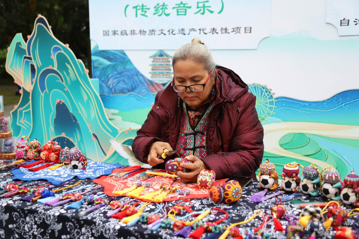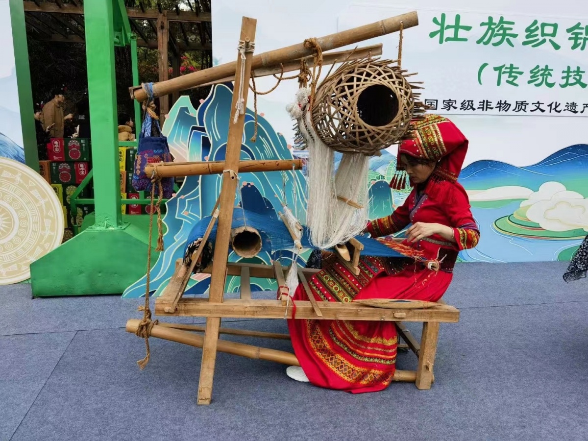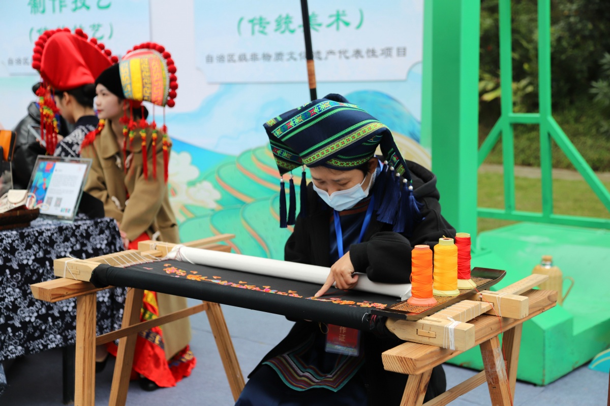 在“壮美广西·多彩非遗”非遗展示区,美丽的壮族姑娘唱着国家级非遗代表性项目壮族三声部民歌,向嘉宾和游客们敬献列入联合国教科文组织人类非遗代表作项目六堡茶;在国家级非遗代表性项目壮族天琴艺术弹唱的乐声中,大家可以互动体验国家级非遗代表性项目侗族木构建筑营造技艺、自治区级非遗代表性项目壮族刺绣、右江壮族麽乜制作技艺,感受非遗手作的魅力;听着自治区级非遗代表性项目侗族琵琶歌的歌声,大家可以亲身参与国家级非遗代表性项目瑶族油茶、龟苓膏和自治区级非遗代表性项目五色糯米饭的制作,体验制作过程,品尝非遗美味;大家还可以一边欣赏国家级非遗代表性项目桂林渔鼓和彩调剧《刘三姐》选段的美妙歌声,一边在国家级非遗代表性项目壮族织锦技艺展示的织机上感受织布劳动的乐趣。
