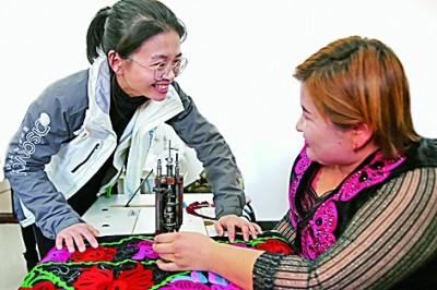 邵书琴(左)与刺绣合作社社员交流。资料照片
