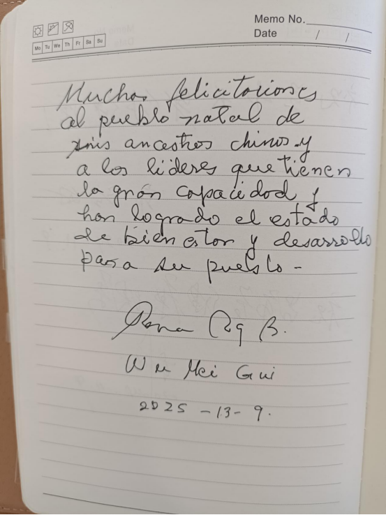 图为多米尼加原总统顾问吴玫瑰女士为家乡题词