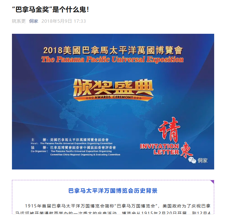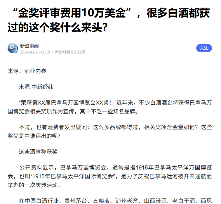 报告显示,2023至2026年间虚假宣传类违法已占白酒行政处罚的80%以上,罚款总额累计破亿元。其中最具代表性的便是被明码标价的“国际金奖”收割链。以美国巴拿马万国(国际)博览会组委会北京代表处为代表的机构,因虚构与1915年博览会的历史承袭关系,被监管部门定性为引人误解的虚假宣传。这类机构将金奖标价30至50万不等,无需寄酒评审,给钱即可发证。