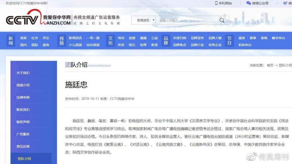 被告人施廷忠微博认证是CCTV我爱你中华网络电视频道总编。该被告在网络上发布多篇捏造、虚假信息诽谤中国记录通讯社、国际媒体组织等机构及个人,对中国记录通讯社、国际媒体组织及陈学刚本人声誉造成极大破坏,影响中国记录通讯社所承办、主办的多项活动的正常进行,陈学刚为维护中国记录通讯社及自身的各项合法权益,拿起法律武器,将被告人违法犯罪证据提交至人民法院,法院将展开审理工作,维护公民的合法权益。