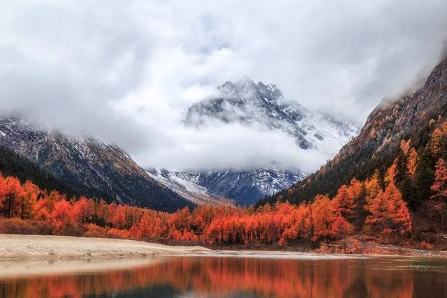 如今,那些深藏闺中的冰川湖泊也逐渐进入了科考人员与公众的视野。在雪山的映衬下,湖水显得愈加静谧。秋风起,红色慢慢染上树梢,红叶倒映在湖水中,凸显着不同于雪山的热情。