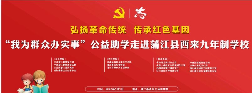 6月1日,在一年一度的“六一”儿童节之际,由中共蒲江县委宣传部、蒲江县教育局、共青团蒲江县委、成都高新区志愿者协会主办,成都高新区芳草义工总队、蒲江县志愿者协会、蒲江县西来九年制学校承办的暖意浓浓的爱心活动“我为群众办实事,公益助学进校园”志愿服务活动在蒲江县西来镇九年制学校举行。
