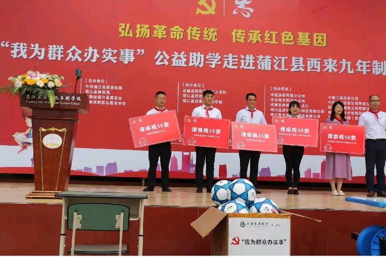 县委常委、宣传部长袁雪峰出席活动并会见捐赠企业代表,县委宣传部常务副部长、文明办主任陶勇致辞,县教育局、县文明办、高新志协负责人和来自中建三局西南分公司、中建壹品投资公司西部分公司、中建深装西南公司、中冶南方四川公司、四川壹灵壹教育科技公司、农商行蒲江支行、彩虹集团、四川昊远建设、莱可吉米科技、芳草义工的爱心企业代表,学校师生代表参加活动。捐赠仪式上,四川昊远建设工程有限公司董事长杜于斌先生向学校捐赠了课桌椅等学生用品。