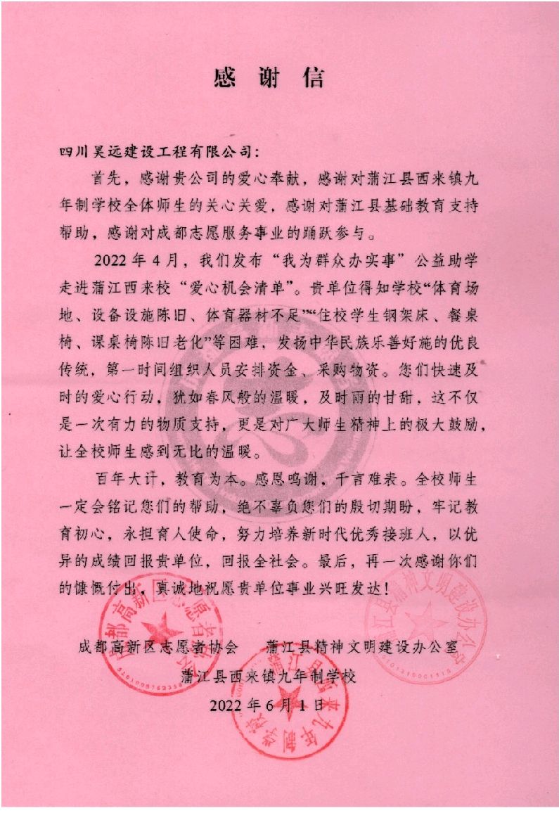 本网讯【记者袁军】近日,四川昊远建设工程有限公司收到一封由蒲江县精神文明建设办公室、成都高新区志愿者协会、蒲江县西来镇九年制学校联合发来的《感谢信》。这封热情洋溢的感谢信,字里行间体现着蒲江县精神文明建设办公室、成都高新区志愿者协会、蒲江县西来镇九年制学校对公司主动作为、勇担使命和甘于奉献精神的崇高敬意,对公司捐赠行为给予了充分认可和高度赞誉。