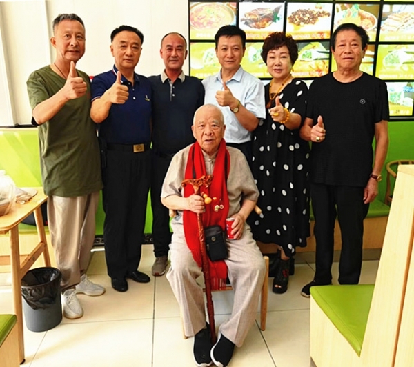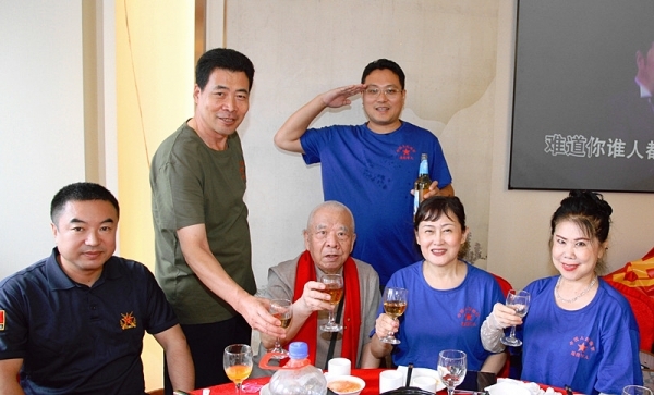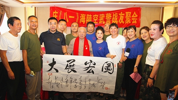 104岁高龄的老红军袁存建先生,在天津与老兵代表,合唱军歌,讲述革命故事,回顾他参加战斗和在朱德总司令身边工作的革命历程,以实际行动开展爱国主义教育。袁存建先生还将自己亲笔写的“大展宏图”精品书法作品献给老兵代表,鼓励大家为祖国繁荣昌盛贡献力量。
